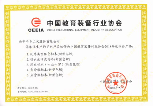 通過專家評委層層篩選,南寧千年工藝股份有限公司生產(chǎn)的“千帆”品牌新型包埋標本:花序類型保色標本(新型包埋)、蝗蟲生活史標本(新型包埋)、昆蟲標本(六害六益)(新型包埋)、兔外形標本(新型包埋)、魚骨骼標本(新型包埋),共5款產(chǎn)品榮獲中國教育裝備行業(yè)協(xié)會2018年度推薦產(chǎn)品。